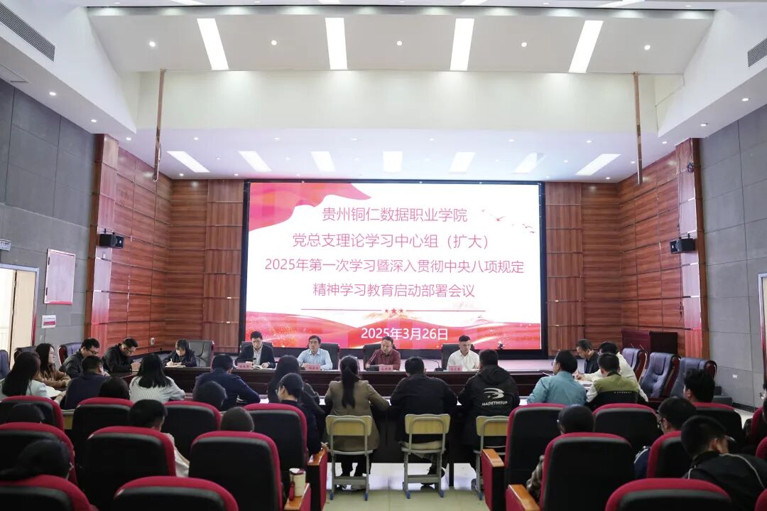 3月26日下午,贵州铜仁数据职业学院党总支召开理论学习中心组(扩大)2025年第一次学习暨深入贯彻中央八项规定精神学习教育部署会。校党总支书记肖洪涛主持会议并讲话。校党总支成员,行政领导班子、中层干部、各党支部负责人及全体党员、思政教师、辅导员参加会议。